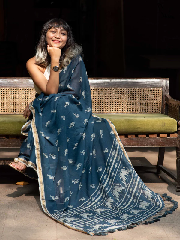 Fabindia offers eco-friendly and ethically sourced sarees crafted by rural artisans. Known for earthy tones and handwoven textures, it showcases traditional crafts like block printing and ikat. Perfect for conscious shoppers who love minimalist elegance with a strong cultural connection and sustainable flair.
